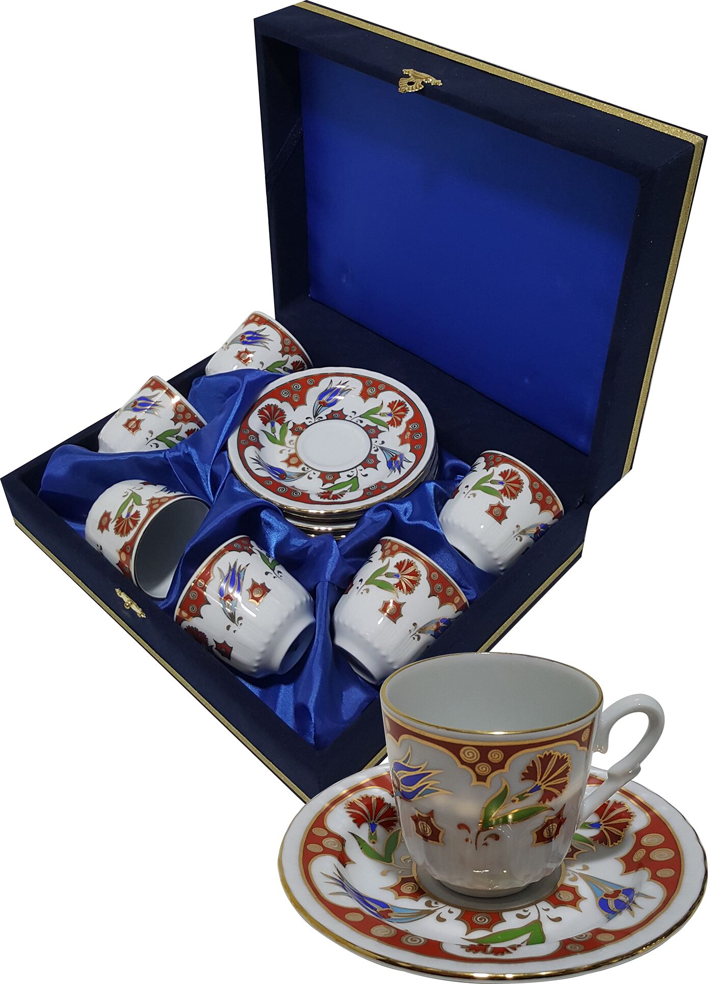 - 6 Kişilik Tabaklı Türk Kahvesi Takımı. 6 Adet Fincan ve 6 adet tabaktan oluşmaktadır.