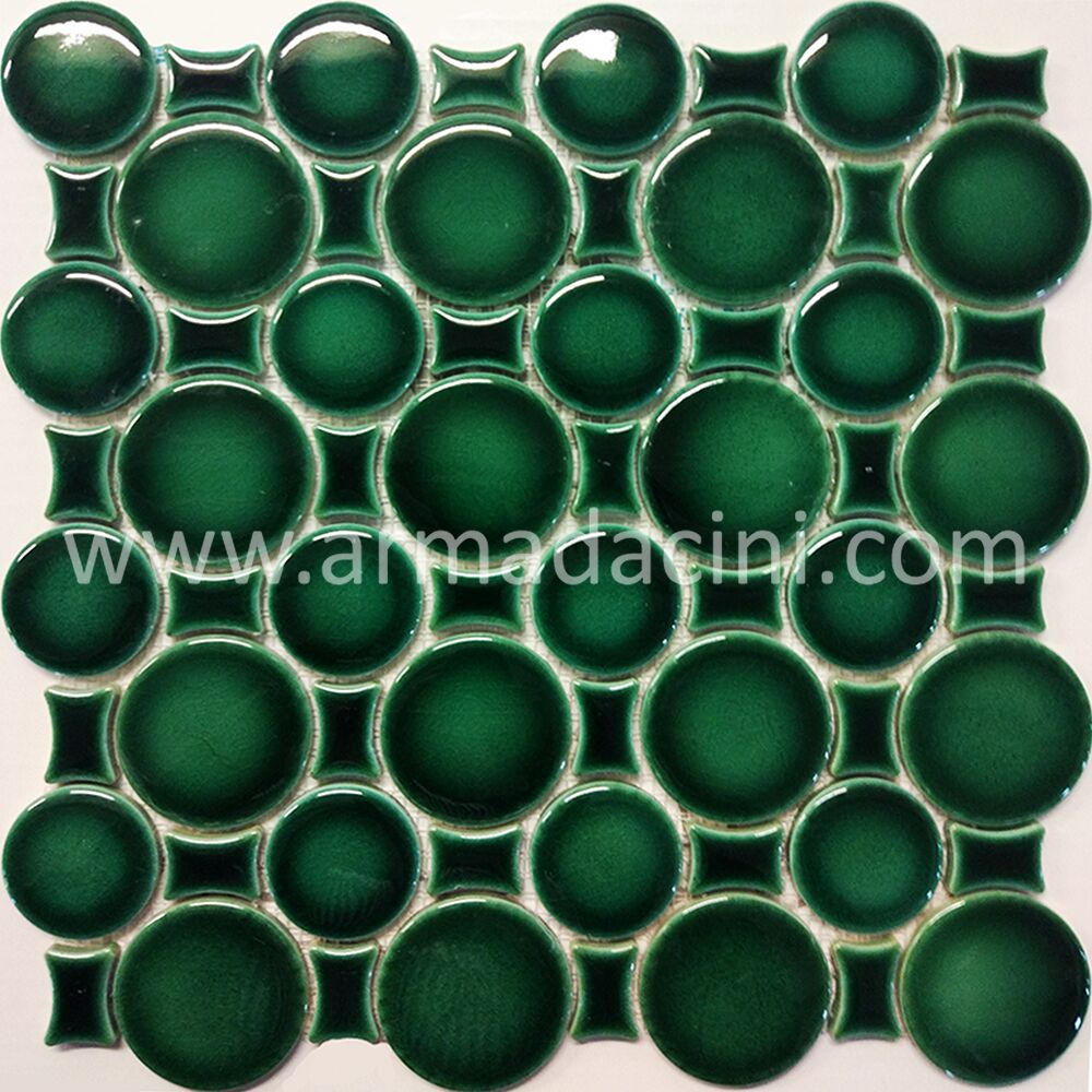 - Yeşil Yuvarlak Porselen Fileli Mozaik Krakleli Çini çinileri süsleme sanatı ile mimari ifadeye katılan bir boyuttur.